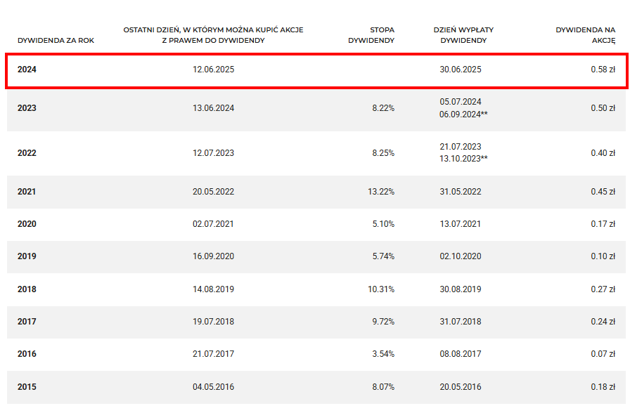 Dniem dywidendy będzie 16 czerwca, z kolei wypłata została zaplanowana na 30 czerwca 2025 roku.