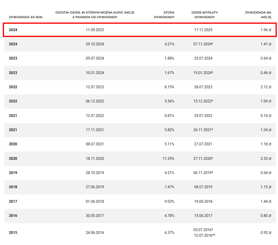 Jako dzień dywidendy wyznaczono 15 września, kolei dzień wypłaty ustalono na 17 listopada 2025 roku. Ostatnim dniem, w którym można nabyć akcję z prawem do dywidendy to 11 września br.
