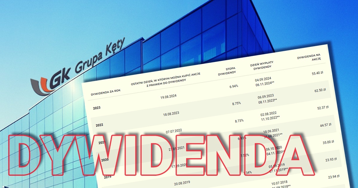 Grupa Kęty należy do najbardziej konsekwentnych spółek dywidendowych na GPW. Dywidendę wypłaca nieprzerwanie od 2001 roku, a od 2005 roku co najmniej 4 zł na akcję corocznie. Szczególnie imponujące były wypłaty z ostatnich lat – m.in. 62,50 zł w 2023 roku oraz 55,40 zł w 2024 r., co dawało odpowiednio 8,75% i 6,94% stopy dywidendy.