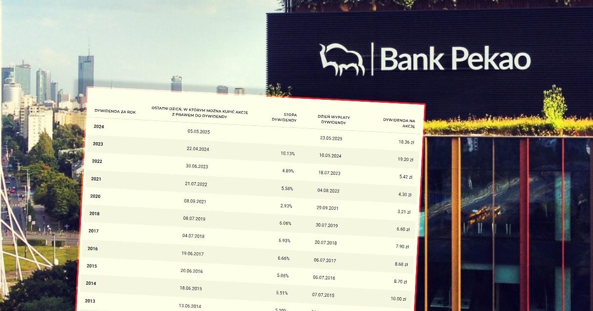 Bank Pekao może pochwalić się imponującą historią regularnych wypłat dywidend, sięgającą początku obecnego stulecia. W ostatnich dwóch dekadach bank dzielił się zyskiem niemal każdego roku, często przy bardzo atrakcyjnych poziomach stopy dywidendy. W 2024 roku stopa dywidendy wyniosła ponad 10%, w 2023 roku – 4,89%, a jeszcze wcześniej – często przekraczała 6%. Tylko w kilku latach – głównie w okresie po kryzysie 2008 roku i w początkach pandemii – wypłaty były ograniczone lub pominięte.