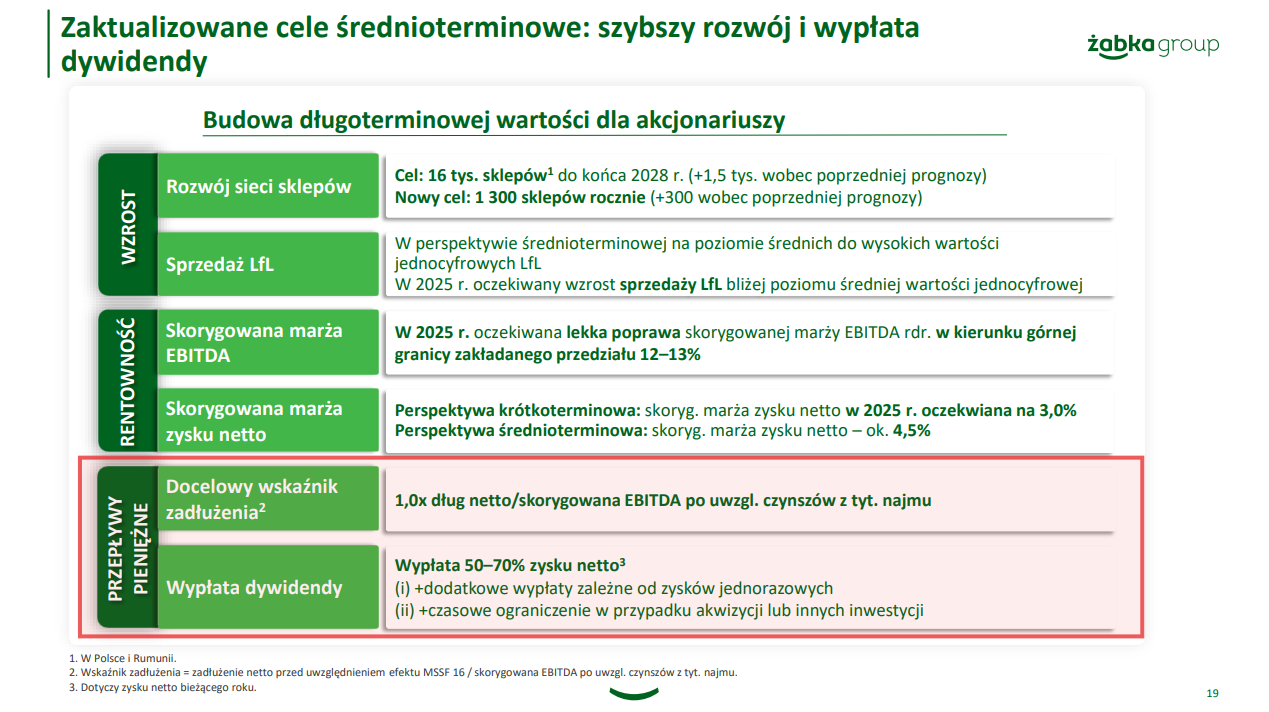 W dłuższym horyzoncie Żabka nie wyklucza również uruchomienia programów skupu akcji własnych jako uzupełnienia dywidendy.