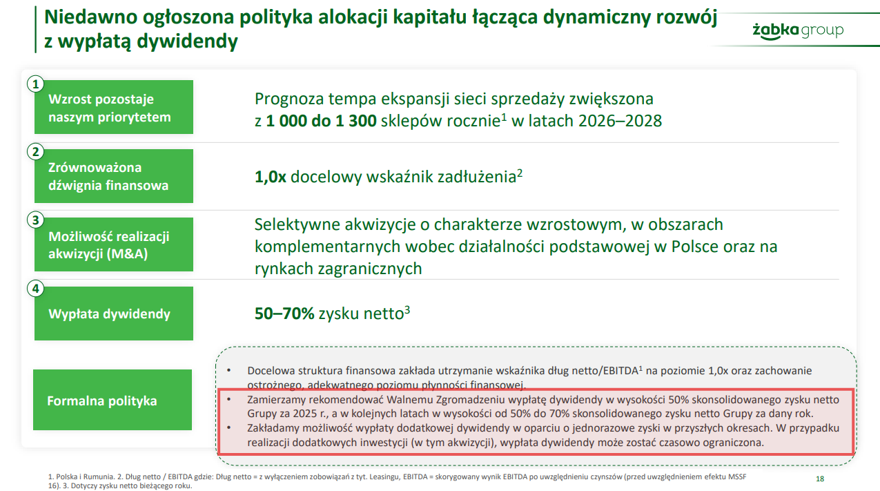 Żabka potwierdziła gotowość do wypłaty pierwszej dywidendy w 2026 r. z zysku za 2025 r., a zarząd na konferencji wynikowej zaznaczył, że spełniono warunki finansowe przyjętej polityki do zarekomendowania wypłaty na poziomie 50% skonsolidowanego zysku netto, z opcją wzrostu wskaźnika wypłat do 50–70% w kolejnych latach. Zarząd podkreślił, że jest także możliwe wykonanie dodatkowych transferów kapitału przy zyskach jednorazowych lub nadwyżkach gotówki.