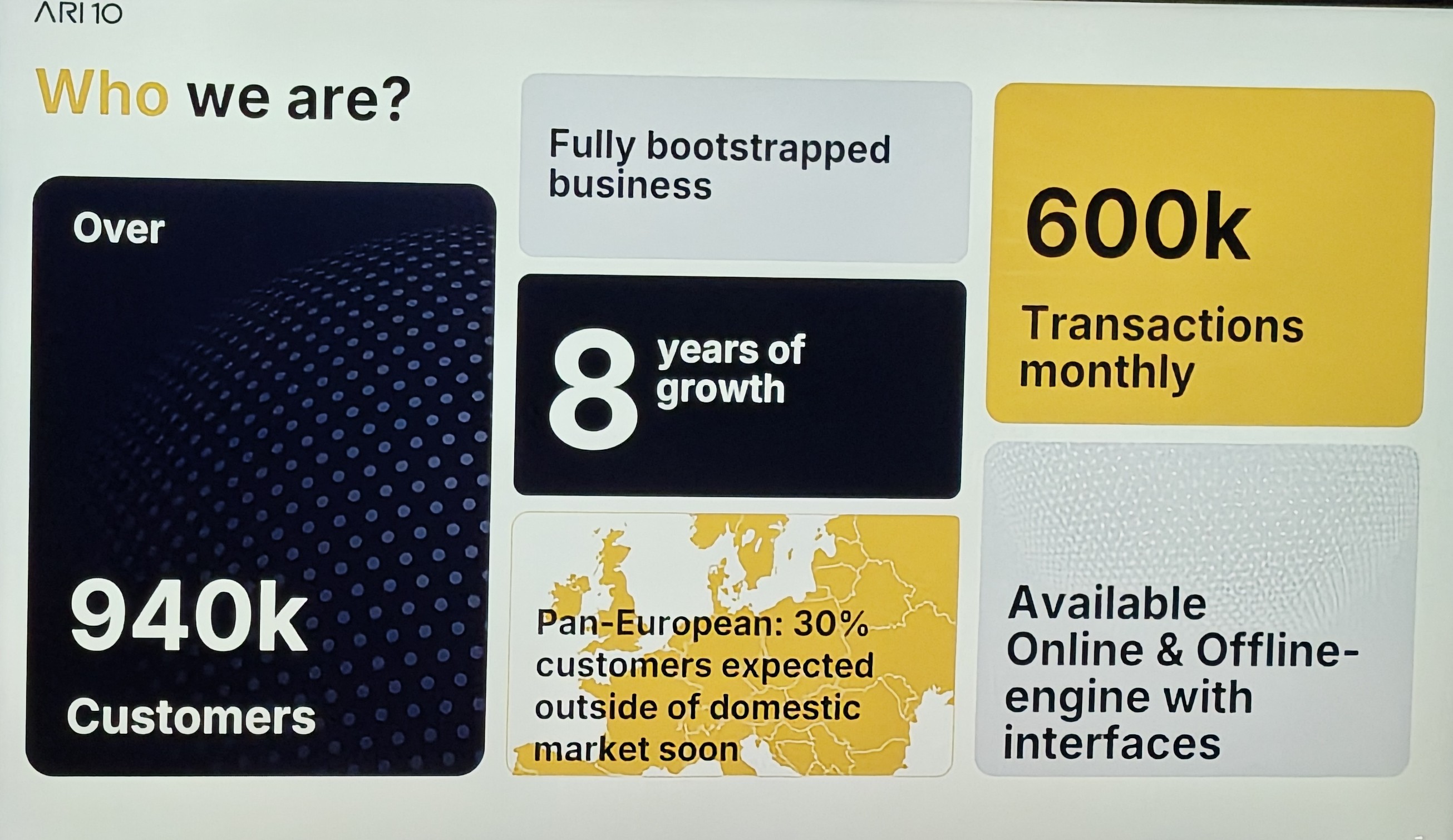 Mateusz Kara, CEO ARI10, podał, że w 2024 r. spółka przetworzyła ok. 230 mln USD obrotu, w 2025 r. plan zakłada 345 mln USD. Na 2026 r. ARI10 prognozuje 550 mln USD organicznie, a po domknięciu dwóch transakcji M&A — dodatkowo ok. 63 mln USD z przejmowanej spółki B2C oraz ok. 433 mln USD z nabywanego podmiotu PSP — co ma dać łącznie ponad 1 mld USD obrotu w 2026 r. Jak podał CEO, platforma pozostaje rentowna trzeci rok z rzędu i zatrudnia ok. 100 osób.