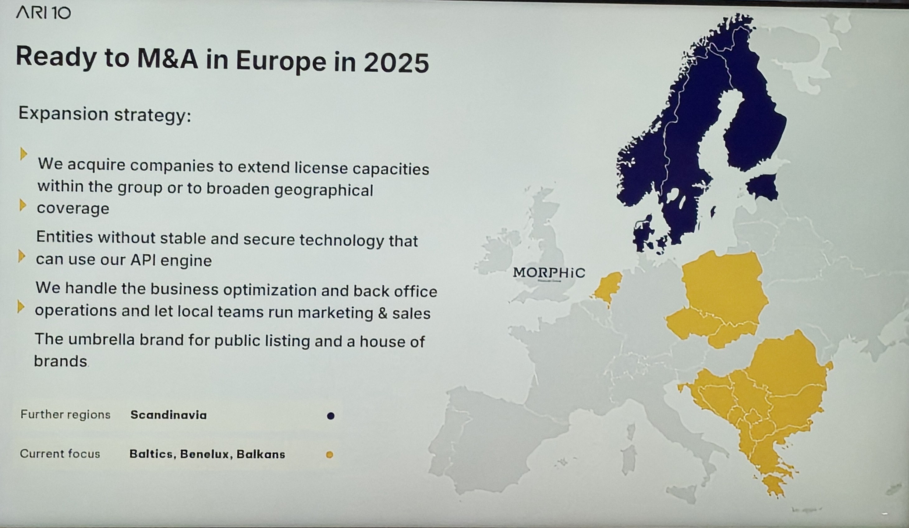 Kapitał na zapowiedziane w prognozach finansowych przejęcia ma pochodzić ze środków własnych. Umowa przejęcia podmiotu B2C została już podpisana, a w przypadku PSP zawarto term sheet. Finalizacja wymaga zgody regulatora i może potrwać 6–8 miesięcy, podał zarząd ARI10. Jednocześnie platforma planuje giełdowy debiut, który ma służyć przyspieszeniu akwizycji fintechów w Europie. Strategia wzrostu opiera się na dwóch filarach M&A pod parasolowym holdingiem Morphic Financial (UK) budowanym jako „house of brands”.