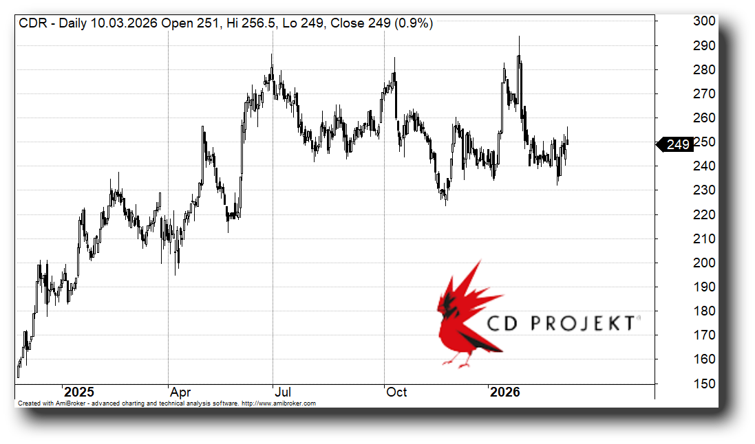 “Podwyższamy do Przeważaj (poprzednio Neutralnie) krótkoterminową rekomendację relatywną dla CD Projektu, ponieważ oczekujemy zapowiedzi nowych gier w ciągu nadchodzących miesięcy” - napisano w najnowszym raporcie DM BOŚ, Research Report – Polish Equities Monthly: 3/2026.