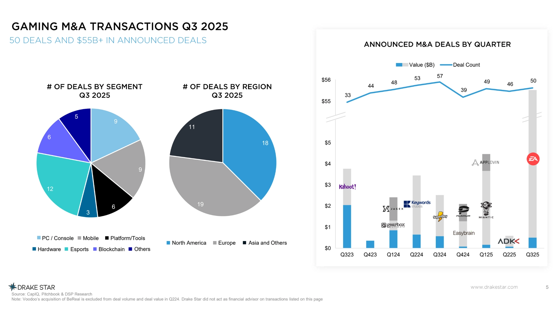 Jak podał Drake Star, w trzecim kwartale 2025 r. liczba transakcji M&A w gamingu wzrosła do 50 – to najwyższy poziom od czterech kwartałów. Symbolicznym punktem zwrotnym było ogłoszone przejęcie Electronic Arts przez konsorcjum PIF z Arabii Saudyjskiej i Silver Lake za 55 mld USD – największy lewarowany wykup w historii sektora.