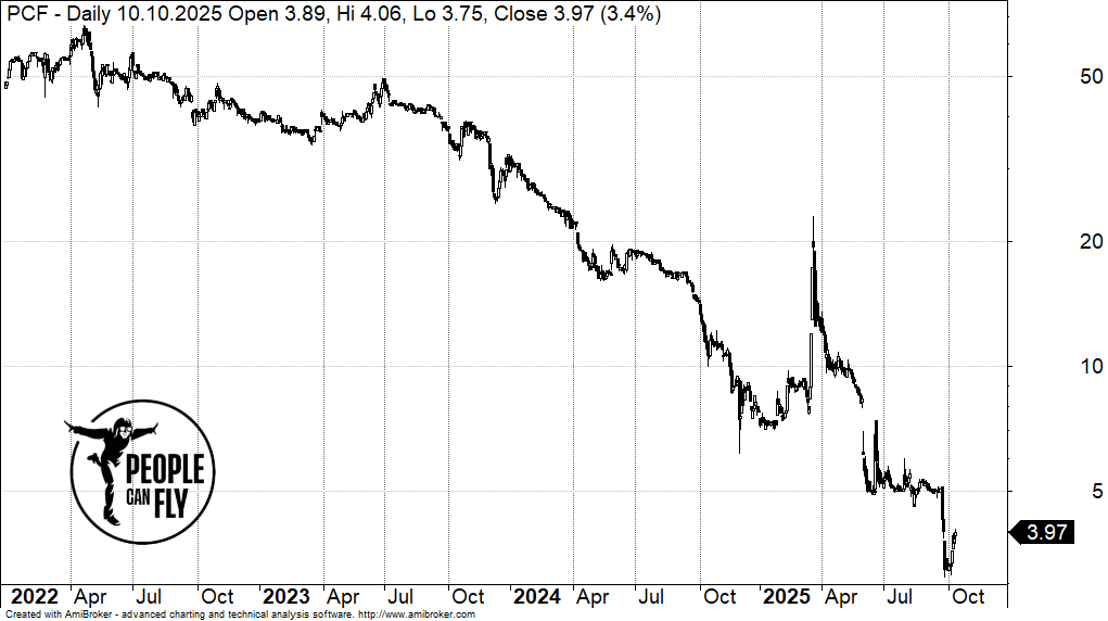 PCF Group, czyli studio People Can Fly, to przypadek złożony. Krafton, posiadający istotny pakiet, jest naturalnie potencjalnym kupującym. Dotychczasowa historia PCF na GPW to pasmo totalnych rozczarowań. Prezes, który przy debiucie ustawiał się w jednym rzędzie z CD Projekt, teraz obejmuje emisje ratunkowe. Wartość akcji od debiutu spadła o ok. 95% do ok. 3 zł, a inwestorzy wyraźnie utracili zaufanie. Jeśli Krafton zdecydowałby się zwiększyć udziały, mogłoby być to być preludium do delistingu w duchu „naprawy w prywatnych rękach”.