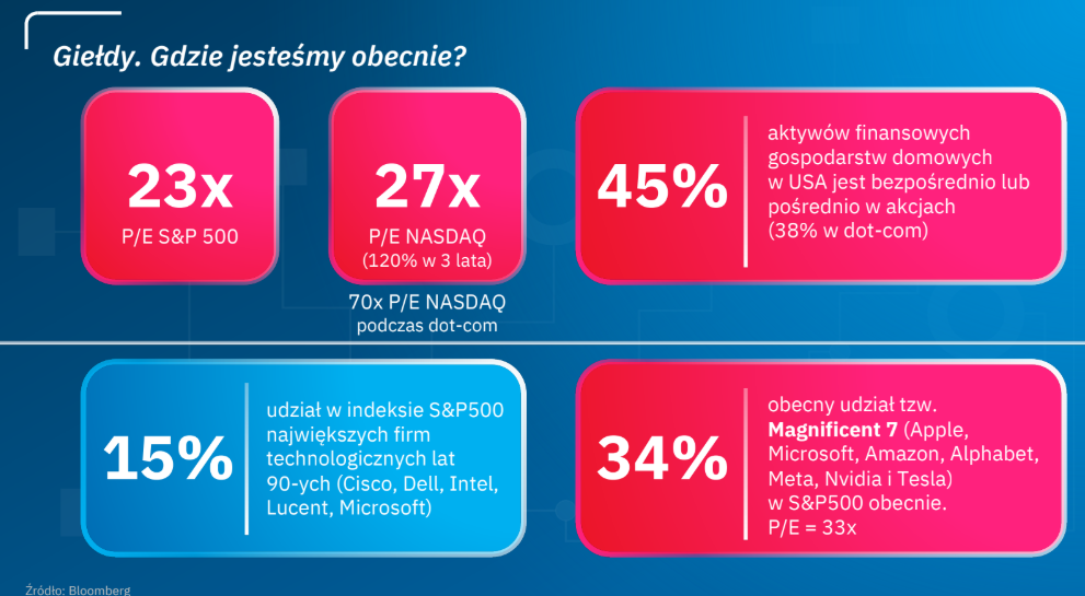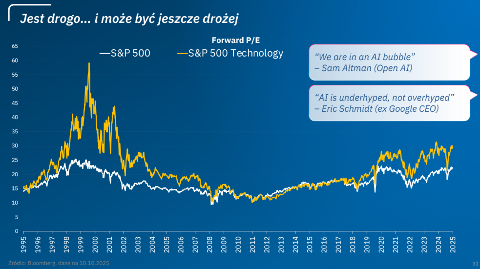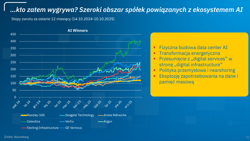 “Z drugiej strony widoczna jest spora doza sceptycyzmu co do możliwości sfinansowania tak dużych nakładów oraz osiągnięcie odpowiedniej stopy zwrotu z inwestycji. Podobna skala narzekania była widoczna rok czy dwa lata temu, jednak tysiące talentów pracujących nad technologią AI regularnie zaskakuje malkontentów. Dla wielu inwestorów aktualny stan rynku może się wydawać nieracjonalny, co wzmacnia przekonanie o ostrożnym podejściu do rynku i niepartycypowania w hossie” - ocenił Witczak.
