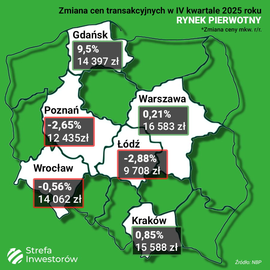 Narodowy Bank Polski opublikował wstępne odczyty cen transakcyjnych mieszkań za IV kwartał 2025 roku. Końcówka 2025 roku nie przyniosła jednego, wspólnego trendu dla całego kraju: część rynków utrzymuje stabilizację, część jest w korekcie, a pojedyncze miasta dalej kontynuują wzrosty. Na rynku pierwotnym najmocniej w ujęciu rocznym drożał Gdańsk, a największą kwartalną korektę widać w Rzeszowie, który stopniowo staje się bardziej istotnym rynkiem. Na rynku wtórnym większość miast zanotowała spadki k/k, ale Warszawa i Kraków wyróżniły się wzrostami względem III kwartału.