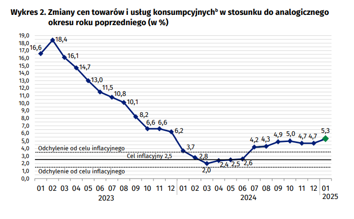 Od kwietnia zeszłego roku inflacja, najpierw delikatnie, potem trochę szybciej ale rosła. W listopadzie nastąpił lekki spadek CPI z 5,00 proc. do 4,7 proc., który utrzymał się do grudnia. W styczniu 2025 r. wskaźnik inflacji uplasował się na poziomie 5,3 proc.