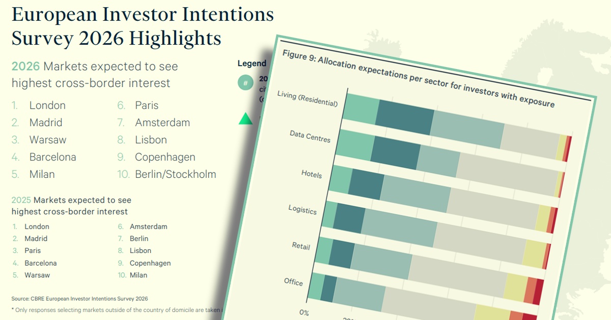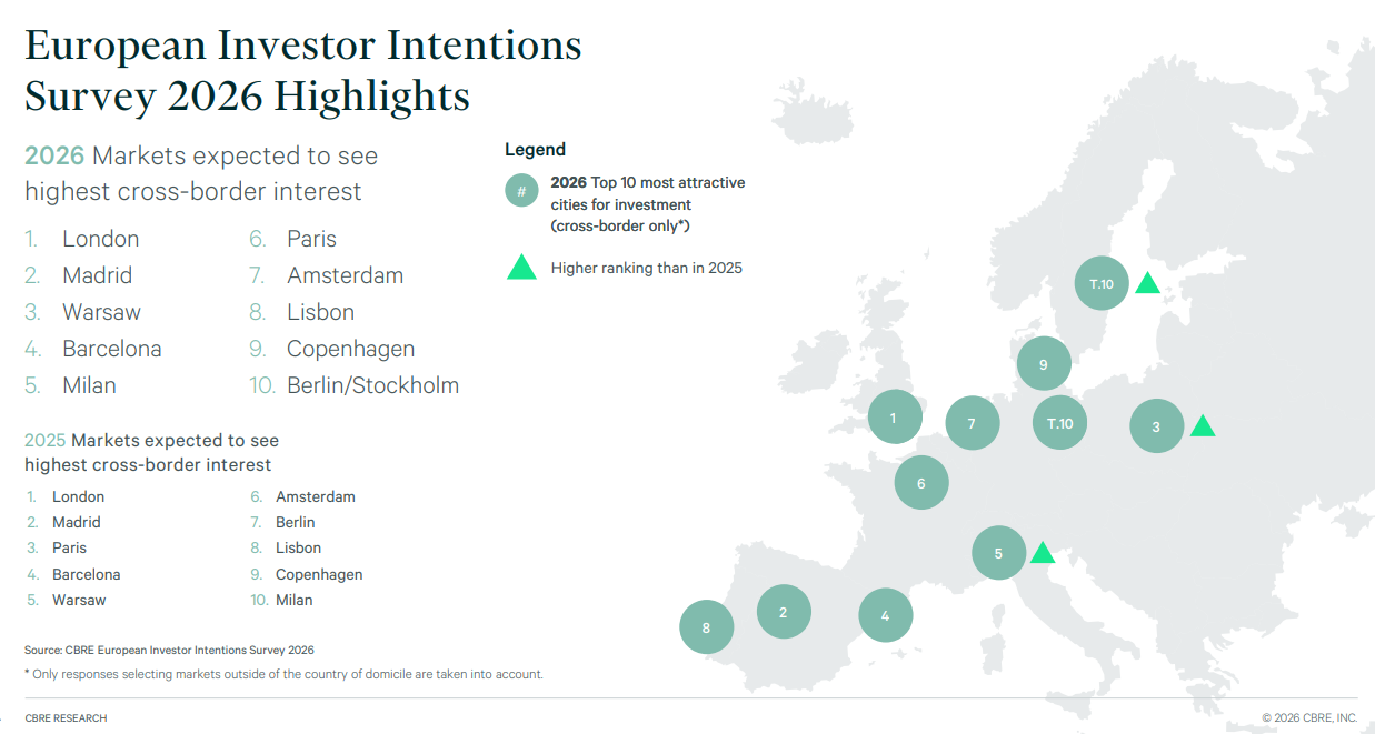 Według badania CBRE zagraniczni inwestorzy zamierzają znacząco zwiększyć zaangażowanie w regionie Europy Środkowo‑Wschodniej. Warszawa zaliczyła przy tym wyraźny awans, trafiając na trzecie miejsce wśród miast uznawanych za najbardziej atrakcyjne dla inwestycji w nieruchomości, wyprzedzając m.in. Berlin i Paryż. Raport „European Investor Intentions Survey 2026” wskazuje też, że region CEE wyróżnia się większą skłonnością do podejmowania ryzyka oraz wyższą pewnością co do otoczenia makroekonomicznego.
