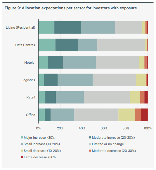 Alokacje kapitału zmieniają kierunek z logistyki dominującej w 2024 r., w stronę bardziej zrównoważonego zestawu sektorów do 2026 r. Nieruchomości mieszkaniowe pozostają kluczowe, pomimo nadal ograniczonych wolumenów inwestycji w niektórych częściach regionu. Znaczenie zyskują nieruchomości handlowe i hotelowe, podczas gdy nieruchomości biurowe odnotowują niewielki wzrost popularności po gwałtownym spadku po pandemii