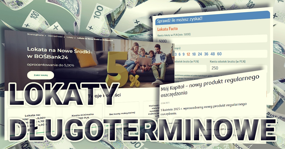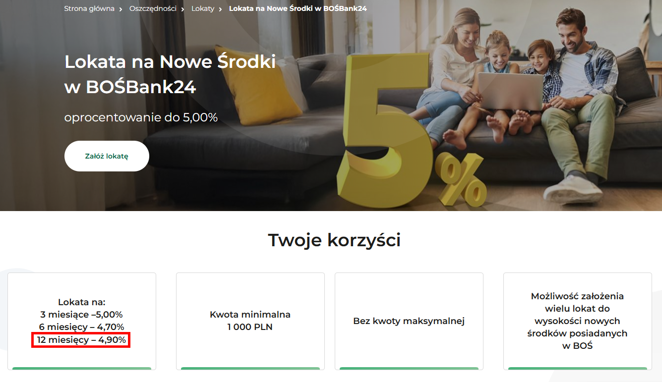 BOŚ Bank dysponuje dwiema wersjami długoterminowych lokaty na nowe środki. Pierwsza dostępna online oferuje solidne 4,90%, natomiast druga (dostępna stacjonarnie w oddziałach) daje 4,45%. Obie skierowane są wyłącznie do klientów wpłacających świeży kapitał, a w przypadku lokaty w placówce obowiązuje limit do 500 000 zł.