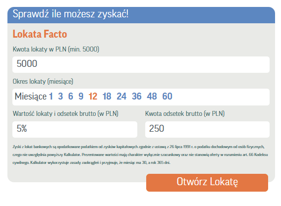 | Lokata Facto | 5,00% | 12 miesięcy | 12 000 000,00 zł | |