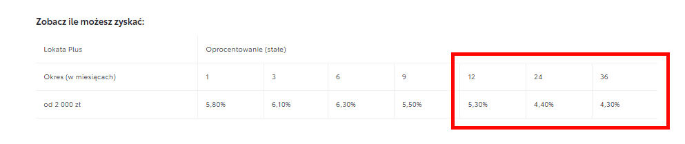 | Lokata Plus | 5,30% | 12 miesięcy | 100 000,00 zł | By założyć lokatę należy posiadać konto. |