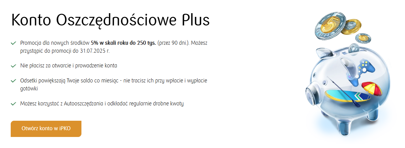 | Konto oszczędnościowe Plus | 5,00% | 90 dni | 250 000,00 zł | Promocja trwa do 31 lipca 2025 roku. |