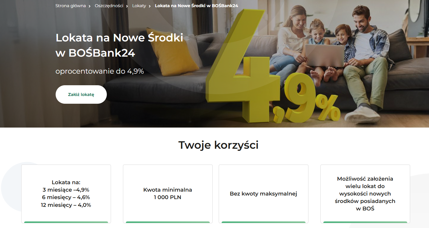 | Lokata na nowe środki | 4,90% | 3 miesiące | Obowiązuje do 8 września 2025 roku. Na dzień otwarcia lokaty należy posiadać nowe środki i założyć lokatę za pośrednictwem BOŚBank24 | |