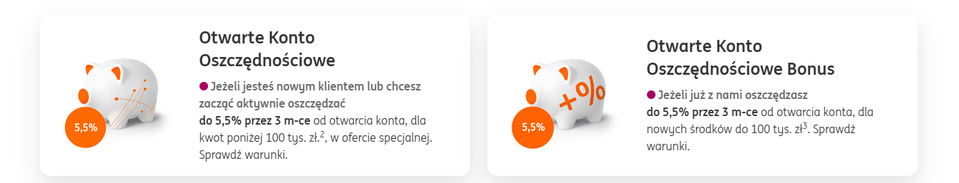 ING Bank Śląski ma Otwarte Konto Oszczędnościowe z oprocentowaniem 5,5% na 3 miesiące, przeznaczone dla nowych klientów. Lokata z funduszem na start oferuje 6,5% na 3 miesiące, z wymogiem ulokowania 70% środków w produkt inwestycyjny. Lokata terminowa PLUS daje 4% na 6 lub 12 miesięcy i dostępna jest wyłącznie dla posiadaczy konta oszczędnościowego.