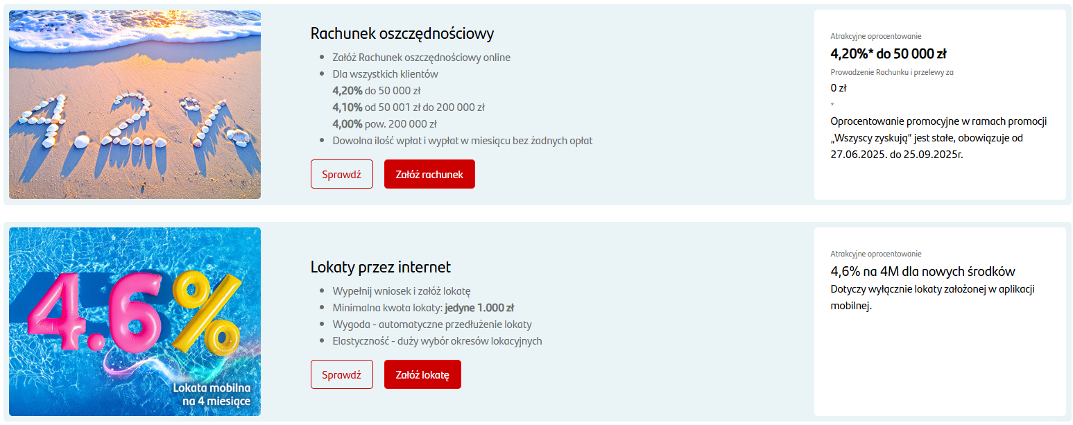 | Rachunek oszczędnościowy | 4,20% | 50 000,00 zł | Oprocentowanie promocyjne w ramach promocji "Wszyscy zyskują" jest stałe, obowiązuje od 27.06.2025 r. do 25.09.2025 r. | |