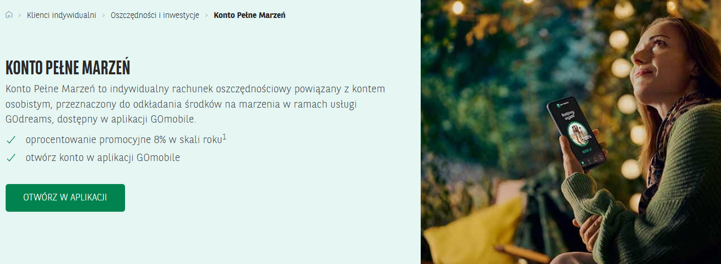 | Konto Pełne Marzeń | 8,00% | Do 30.09.2025 | 10 000,00 zł | Należy zapełnić stały wpływ na konto osobiste oraz wykonać min. 4 transakcję kartą debetową. |