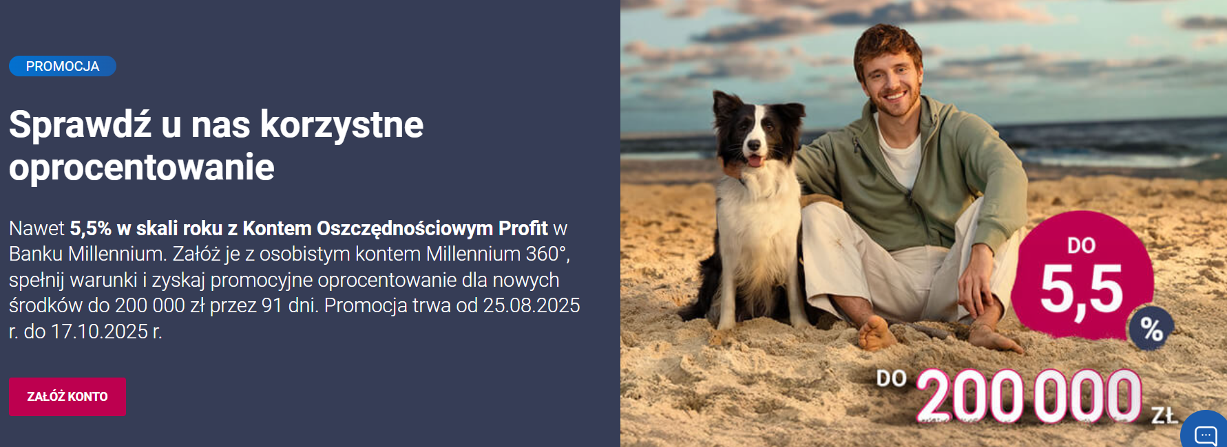 | Konto oszczędnościowe Profit | 5,50% | 91 dni | 100 000,00 zł | Wymaga założenia konta Millennium 360. Promocja trwa do 10 października 2025. |