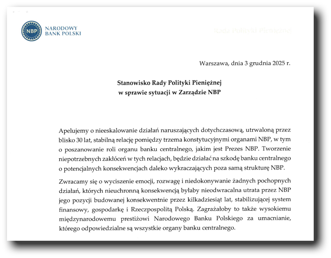 Skupiając się na faktach, a nie jak sugerują sami zainteresowani „doniesieniach medialnych i anonimowych informatorach”, 9 grudnia 2025 roku na stronach NBP opublikowano stanowisko RPP z 3 grudnia 2025 roku w sprawie sytuacji w Zarządzie NBP. W podpisanym przez siedmiu członków RPP oświadczeniu podkreślono konieczność utrzymania stabilności.