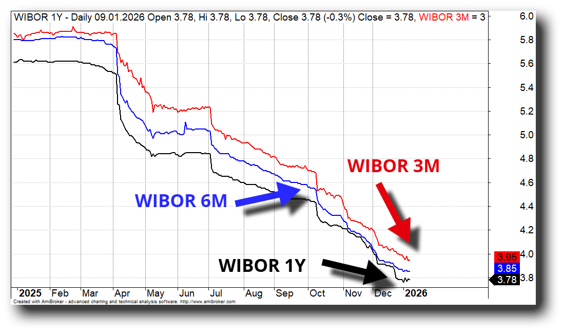 WIBOR, czyli najważniejszy wskaźnik na rynku międzybankowym, który jest kluczowy w wyliczaniu rat kredytów, od grudnia jest poniżej 4 proc. To sygnał kontynuowania dynamicznej zmiany nastrojów rynkowych oraz wiary w kolejne obniżki stop procentowych. To szczególnie korzystne dla osób chcących zaciągnąć kredyt lub już posiadających, ponieważ raty będą spadać. To również istotny komunikat dla szukających oszczędności – 10-letnie obligacje Skarbu Państwa również są coraz niżej.