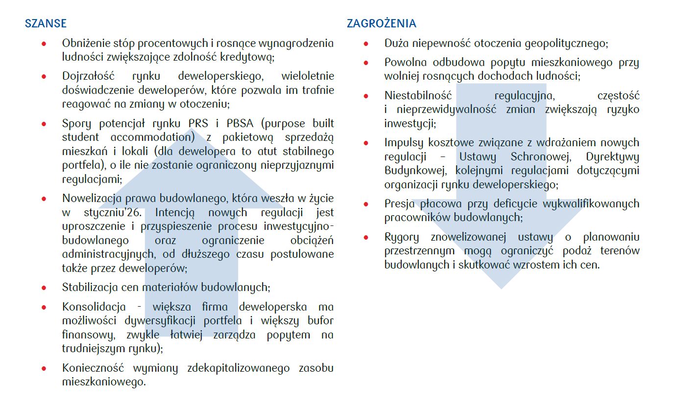 Po stronie popytu mamy 6 obniżek stóp procentowych w 2025 roku i oczekiwania na kolejne, to poskutkowało stopniowym ożywieniem na rynku kredytów mieszkaniowych. Po stronie podaży analitycy wciąż wskazują ryzyko nadpodaży, które pojawiło się w IV kw. 2025 roku. Ponadto, ekonomiści wskazują że w średniej perspektywie wzmacniają się wyzwania demograficzne, które stoją przed rynkiem mieszkań. W nadchodzących miesiącach utrzyma się umiarkowany trend wzrostu kosztów robocizny, a ceny gruntów budowlanych pozostaną wysokie.