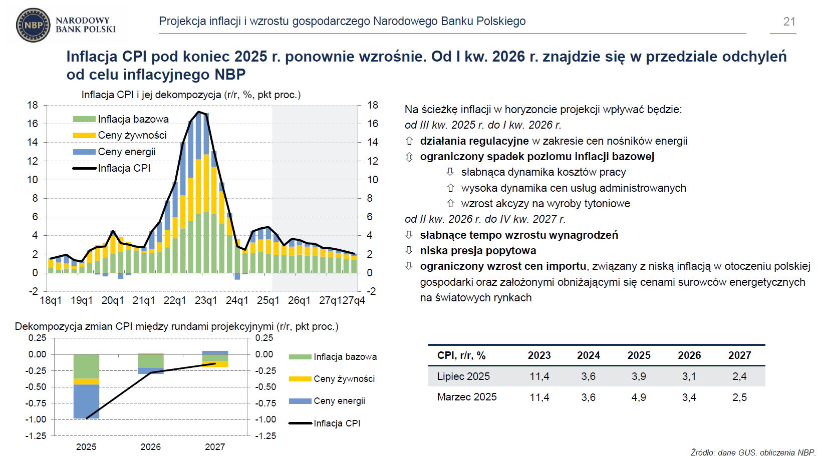Zgodnie z najnowszą projekcją NBP inflacja konsumencka w 2025 r. ma wynieść średnio 3,9 proc., a w 2026 r. spaść do 3,1 proc. Wzrost gospodarczy w tym roku bank centralny szacuje na 3,6 proc.