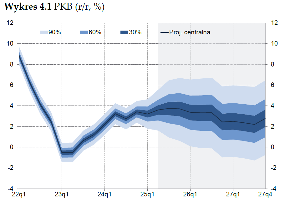 W kolejnych kwartałach przyszłego roku dynamika cen ma stopniowo maleć: w pierwszym kwartale 2026 r. inflacja wyniesie 3,5 proc, a w czwartym już 2,7 proc. Według projekcji w całym 2027 r. ceny konsumenckie będą już bliżej dolnych granic celu NBP – w ostatnim kwartale prognoza wskazuje inflację na poziomie 2,1% r/r.