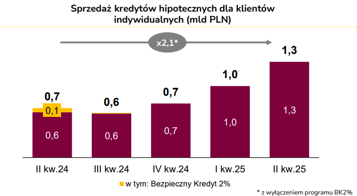W II kw. 2025 r. sprzedaż kredytów na nieruchomości udzielonych klientom detalicznym wyniosła ponad 1,3 mld zł i wzrosła o 93% r/r. Na koniec II kw. 2025 r. portfel kredytów na nieruchomości osiągnął wartość 21,6 mld PLN, a ich udział osiągnął 32,3% (brutto) w portfelu Banku.