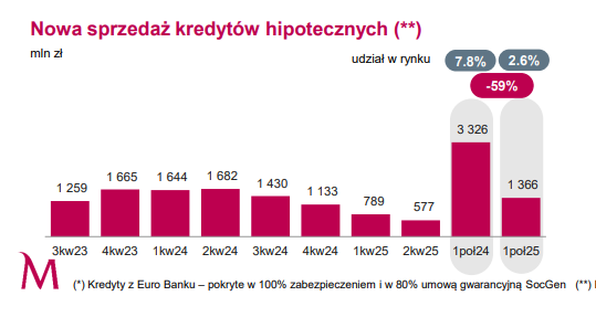 Na tle konkurencji słabo wypadła sprzedaż hipotek w Banku Millennium, która w II kw. wyniosła 577 mln zł, co było ponad 66 proc. spadkiem względem analogicznego okresu 2024 roku. Jeszcze w I kw. sprzedaż plasowała się na poziomie 789 mln zł. W całym pierwszym półroczu udział nowej sprzedaży spadł z 7,8 proc. w 2024 r. do 2,6 proc.