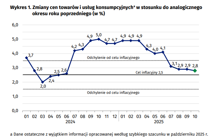 Główny Urząd Statystyczny opublikował szybki szacunek inflacji za październik 2025 r. Według wstępnych danych, ceny towarów i usług konsumpcyjnych wzrosły o 2,8 proc. r/r. Tym samym wskaźnik CPI utrzymuje się w granicach celu inflacyjnego Narodowego Banku Polskiego, wynoszącego 2,5 proc. (+/- 1pp.).