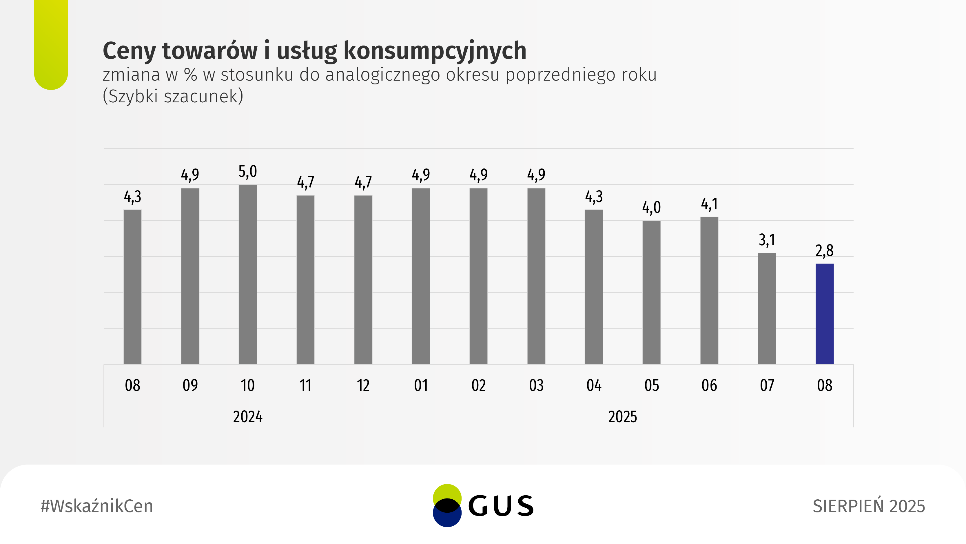 Urząd statystyczny zaprezentował szybki szacunek wskaźnika cen towarów i usług konsumpcyjnych w sierpniu 2025 roku. Wskaźnik CPI, który już drugi miesiąc z rzędu znalazł się w górnej granicy celu inflacyjnego wyniósł 2,8 proc.