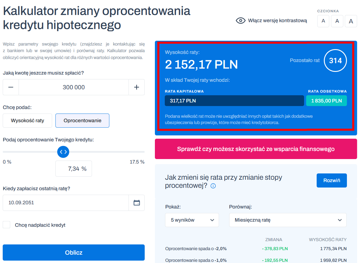 Przy obecnym WIBOR 6M na poziomie 4,84 proc. i tej samej marży oprocentowanie wynosi około 7,3 proc. To oznacza, że rata spadła do mniej więcej 2100 zł.