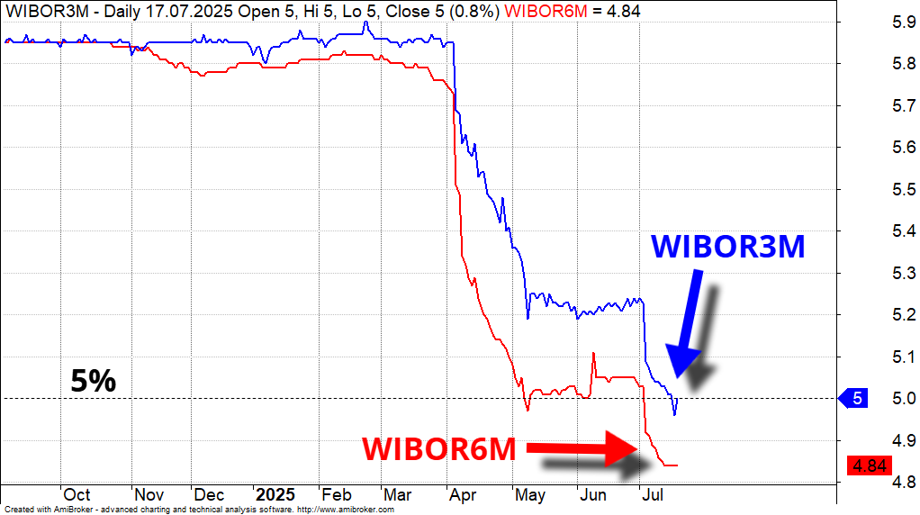 WIBOR 6M od początku lipca utrzymuje się już wyraźnie poniżej 5 proc. – od 17 lipca wynosi 4,84 proc.