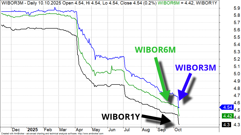 Po trzech z rzędu cięciach stóp procentowych przez Radę Polityki Pieniężnej rynek zaczyna sygnalizować koniec cyklu. Przypomnijmy, że w wyniku październikowego posiedzenia stopa referencyjna wynosi 4,5 proc. Wracając, wskaźniki WIBOR (3M, 6M i 1Y) zatrzymały się na zbliżonych poziomach, co w praktyce oznacza, że inwestorzy wyceniają jeszcze tylko jedną, symboliczną obniżkę kosztu pieniądza.