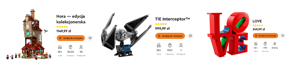 LEGO poleca m.in. zestaw z serii Icons – „Średniowieczny plac miejski”, kolekcjonerską edycję Harry’ego Pottera – „Nora”, „Star Wars TIE Interceptor” oraz serię Botanicals – „Piękny bukiet różowych kwiatów”. Dla pary inwestorów ciekawym wyborem będzie zestaw LEGO Art – „LOVE”.