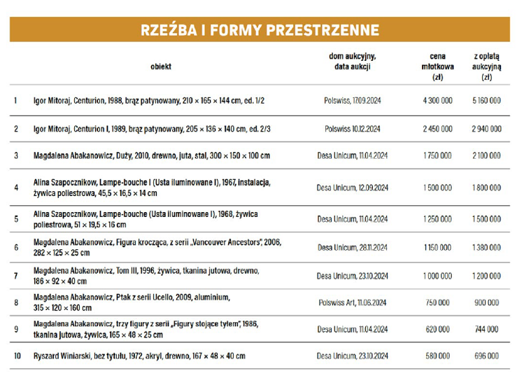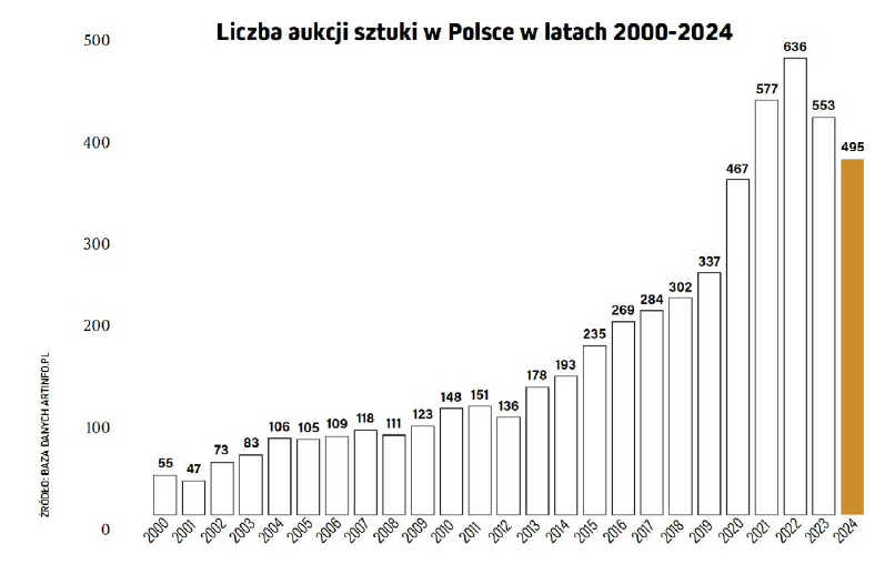 Rok 2024 na polskim rynku aukcyjnym przyniósł odbicie po wcześniejszych spadkach, co widoczne było w rosnących obrotach, mimo utrzymujących się wyzwań w liczbie transakcji i aukcji. Łączna wartość sprzedaży wyniosła 449 mln zł, a na aukcjach wylicytowano 20 950 obiektów. Najdrożej sprzedanym dziełem było „Zatopione miasto II” Andrzeja Wróblewskiego, które osiągnęło cenę 6,48 mln zł. Rekord młodej sztuki ustanowiła Ewa Juszkiewicz z pracą sprzedaną za 3,72 mln zł.