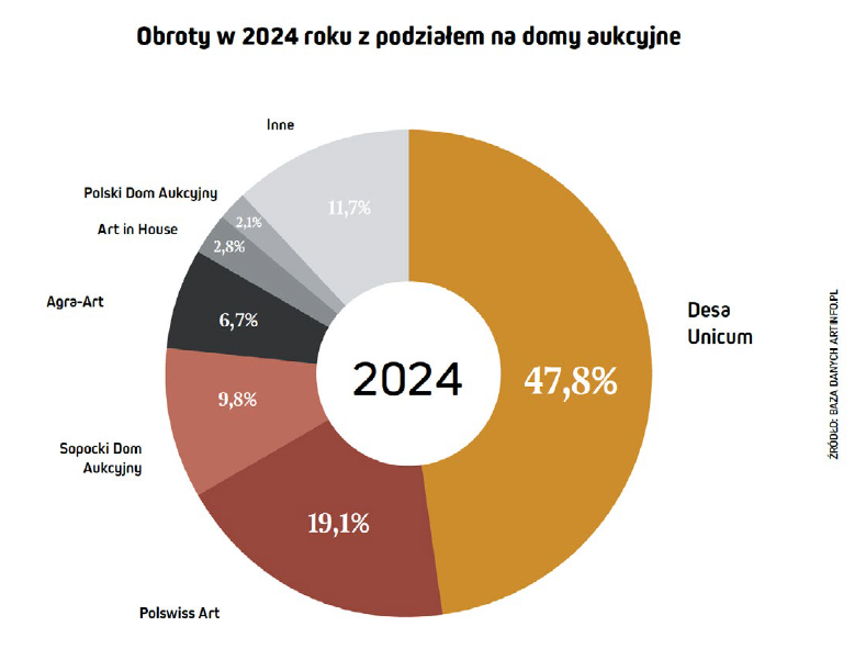 Spośród 44 organizatorów aukcji, największy udział w rynku utrzymały DESA Unicum, Polswiss Art i Sopocki Dom Aukcyjny, które razem odpowiadały za blisko 80% obrotów. DESA Unicum pozostaje liderem, generując niemal połowę całkowitej sprzedaży.