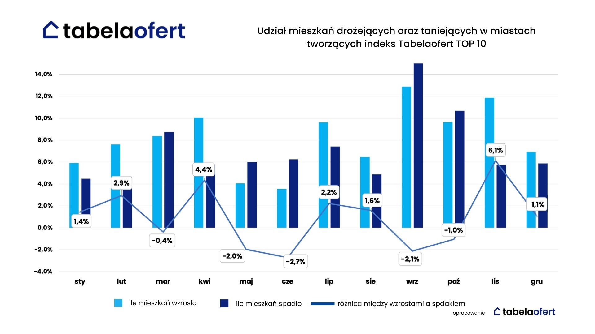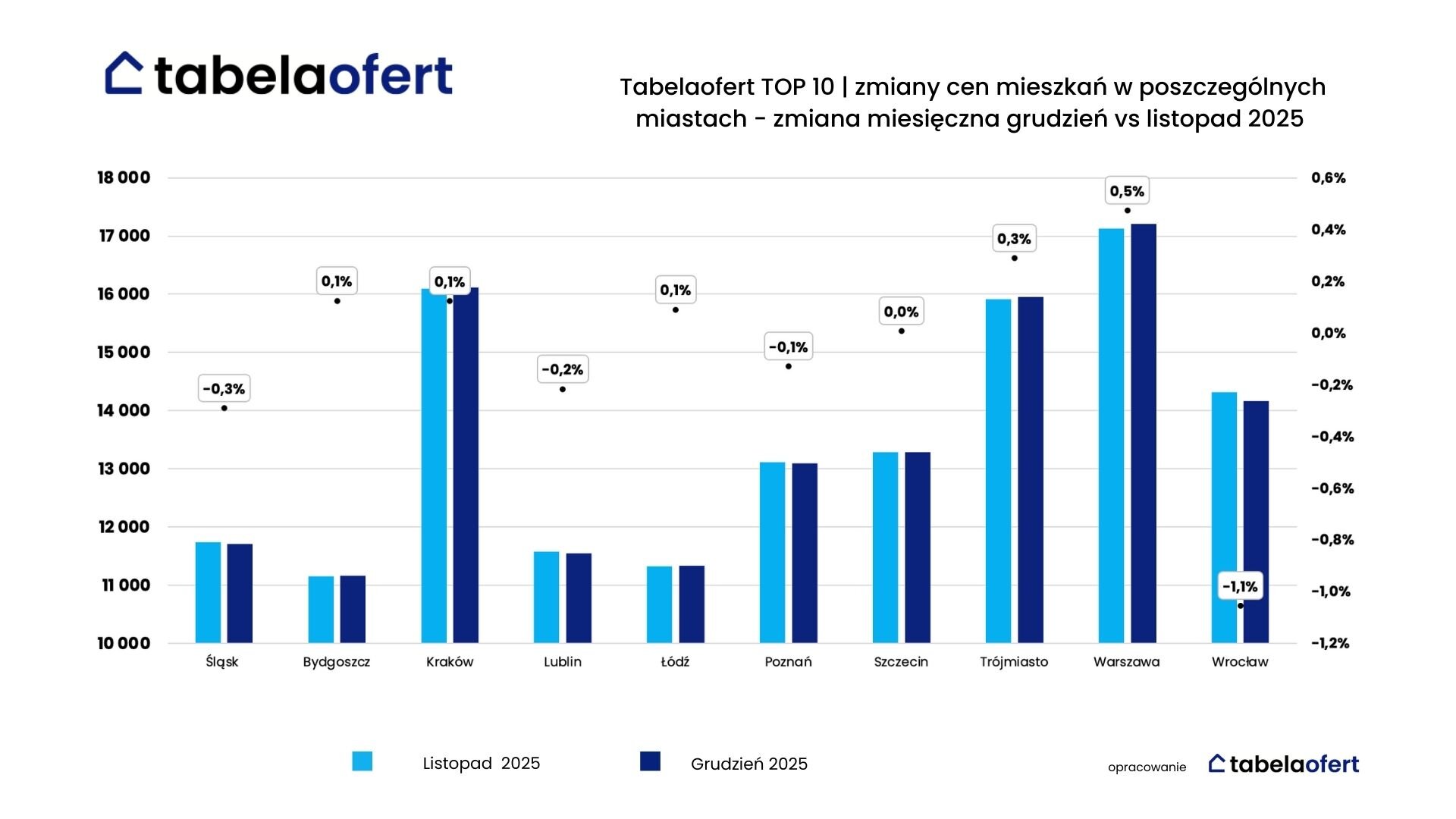 Portal mieszkaniowy Tabelaofert.pl opublikował Barometr Cen Mieszkań – Grudzień 2025, z którego wynika, że sprzedaż mieszkań się utrzymała, a ceny nowych lokali prawie się nie zmieniły. Co więcej, w ujęciu rocznym średnie ceny wzrosły o 1,6 proc. jednak realnie to oznacza ich spadek. Dane zebrane przez portal wskazują, że w grudniu deweloperzy nie dokonali zbyt wielu zmian w cennikach – w 10 największych miastach średnia cena wzrosła o 0,03 proc. m/m, wynosząc trochę ponad 14 tys. zł.