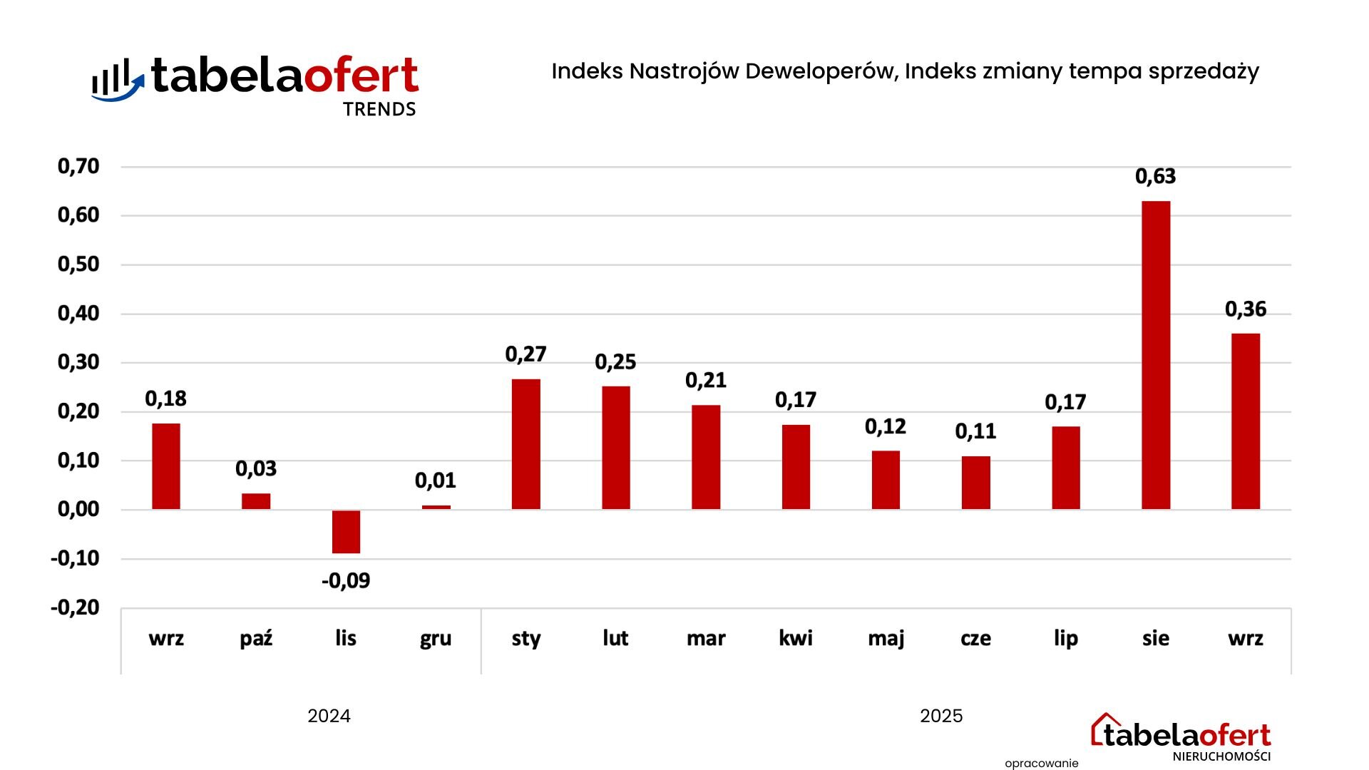 We wrześniu deweloperzy zachowali optymizm mimo ochłodzenia tempa sprzedaży i nowych regulacji w branży. Z wrześniowego Indeksu Nastrojów Deweloperów wynika, że prawie co drugi deweloper spodziewa się ożywienia popytu na rynku pierwotnym mieszkań. Jednocześnie liczba spółek oczekujących stabilizacji rynku wzrosła z 32 do niespełna 49 proc. Również do podwyżek cen mieszkań firmy pochodzą dość ostrożnie – choć ich liczba maleje.