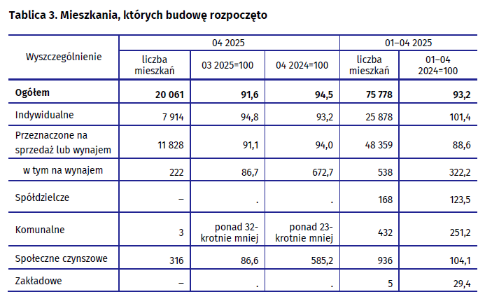 GUS opublikował dane o budownictwie mieszkaniowym w okresie od stycznia do kwietnia br. Do końca kwietnia deweloperzy uzyskali o 25 proc. mniej pozwoleń na budowę niż rok wcześniej, o 11,4 proc. spadła również liczba mieszkań, których budowę rozpoczęto. GUS szacuje, że na koniec kwietnia 2025 roku w budowie pozostawało 848,3 tys. mieszkań, to o 3,7 proc. więcej niż rok wcześniej.