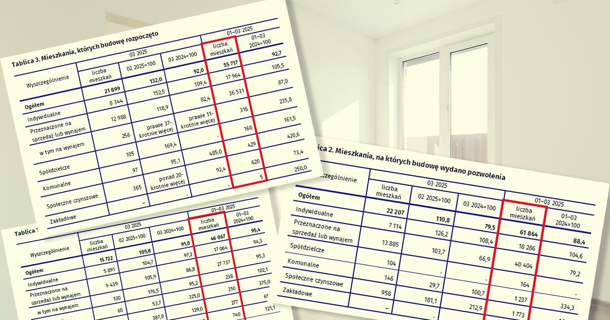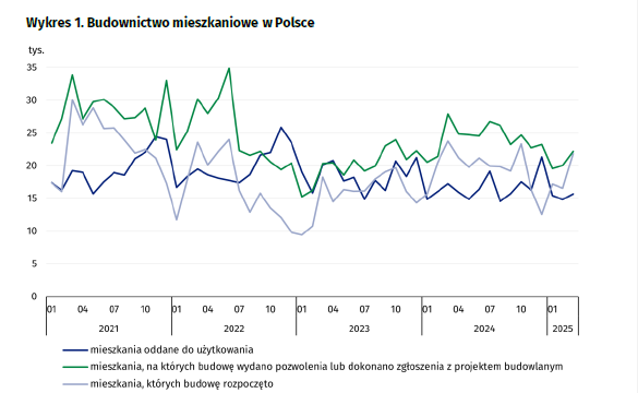 W pierwszym kwartale 2025 roku odnotowano mniejszą liczba mieszkań przekazanych do użytkowania. Spadła również liczba wydanych pozwoleń i rozpoczętych budów.