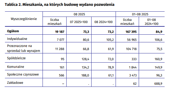 Statystyki GUS z poprzednich miesięcy dotyczące rozpoczynanych w całej Polsce budów wskazywały, że wyniki z lipca (wyraźny wzrost) mogą być początkiem nowej tendencji wzrostowej. Jednak sierpień negatywnie zweryfikował te nadzieje. Liczba budów rozpoczętych w ciągu miesiąca przez wszystkie grupy inwestorów była wyraźnie niższa niż w lipcu (-18 proc.) i sierpniu 2024 roku (-19 proc.) (...) Bieżące dane GUS o rozpoczynanych budowach ogółem należy interpretować także w kontekście statystyki udzielanych pozwoleń. Od początku roku różnica między liczbą uzyskanych pozwoleń a liczbą rozpoczynanych budów wynosi 20 tys., co oznacza, że 12,5 proc. uzyskiwanych pozwoleń ogółem nie ma kontynuacji w realizowanych budowach. Wśród firm deweloperskich odsetek odkładanych pozwoleń jest większy i wynosi 15,5 proc., podczas gdy wśród gospodarstw domowych nie przekracza 3 proc.