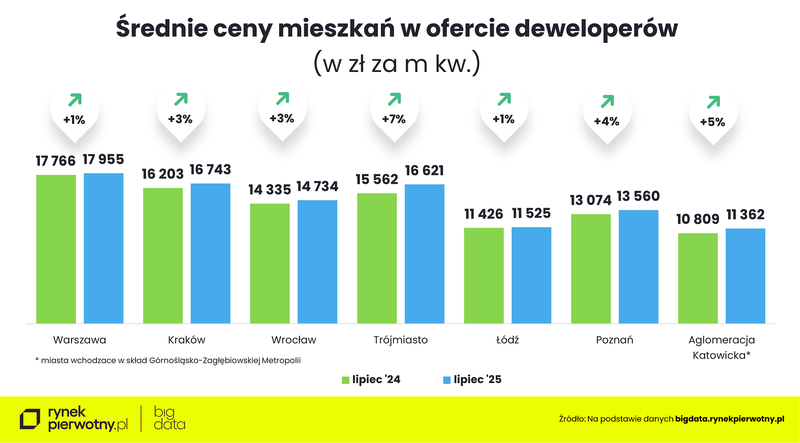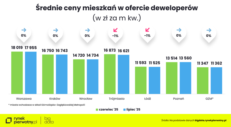 W lipcu w żadnym z największych siedmiu miast nie odnotowano wzrostu średniej ceny metra kwadratowego nowych mieszkań, a w dwóch ośrodkach pojawił się nawet symboliczny spadek.