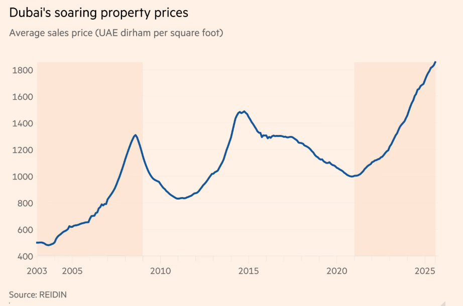 Jak podaje Financial Times, jeśli ceny nieruchomości mieszkaniowych w Dubaju będą dalej rosły – październik będzie 57 miesiącem ich wzrostów. Nastąpiła jednak pewna zamiana w prognozach, agencje ratingowe spodziewają się, że z początkiem 2026 roku ceny dubajskich apartamentów i domów zaczną spadać. Będzie to efekt wzmożonej podaży na rynku.