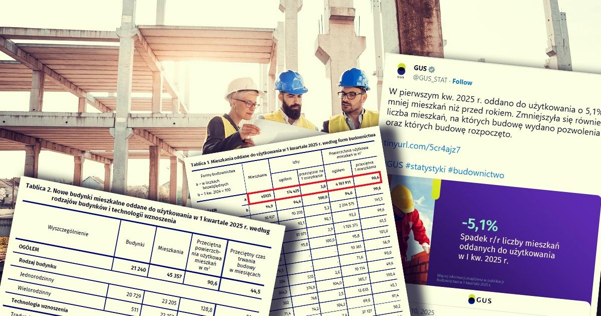 Główny Urząd Statystyczny (GUS) opublikował pełne dane o budownictwie mieszkaniowym w 1 kwartale 2025 roku. Zgodnie z nimi, pierwsze trzy miesiące roku przyniosły w skali roku spadek liczby mieszkań oddanych do użytkowania oraz mieszkań w budowie, jak również tych, na których budowę wydano pozwolenia. Liczba nowych budynków mieszkalnych oddanych do użytkowania spadła o 2,4 proc. w odniesieniu do analogicznego okresu 2024 roku.