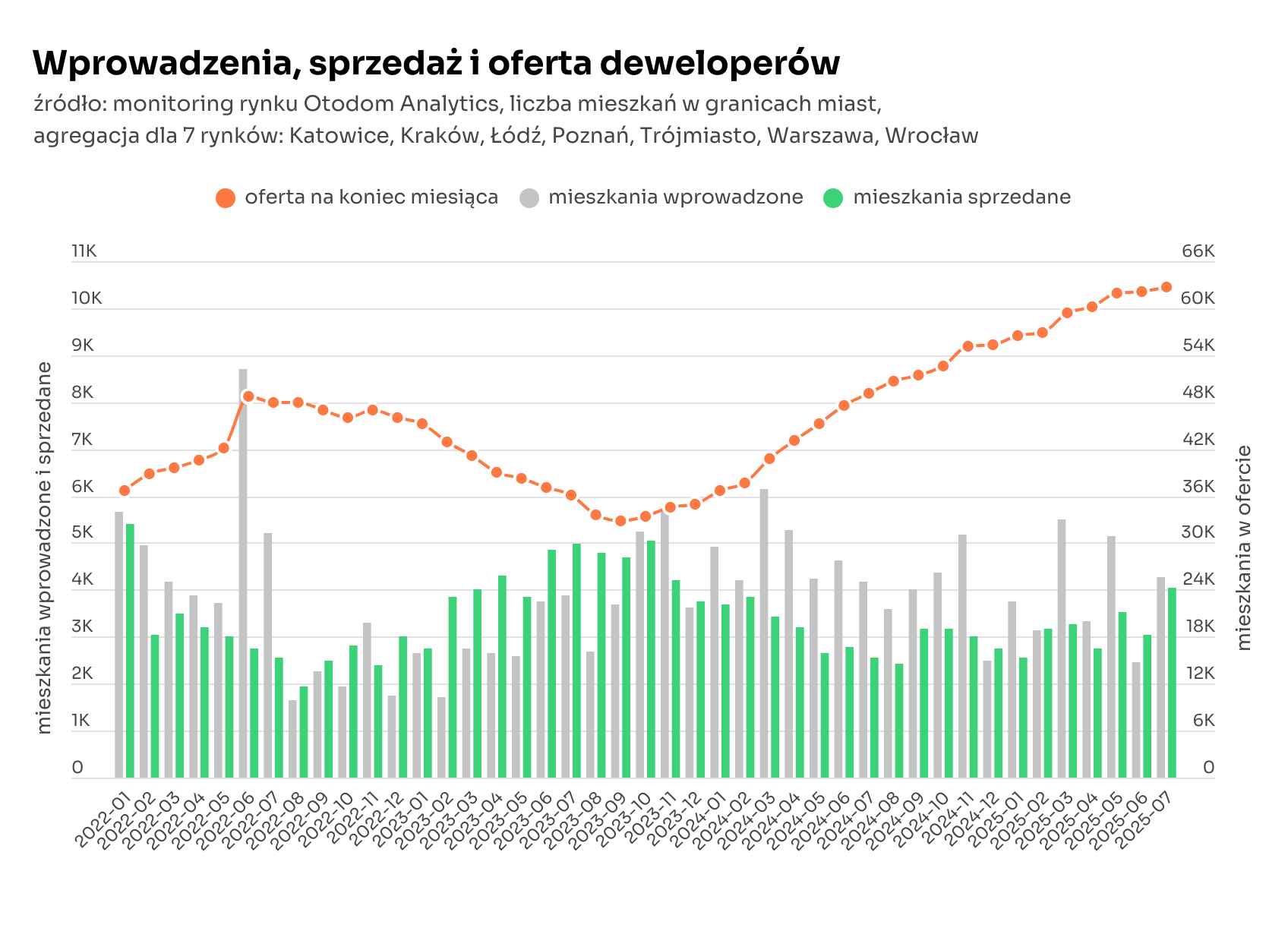 Deweloperzy nie pozostali bierni. Do sprzedaży trafiło blisko 4,3 tys. mieszkań, przez co całkowita oferta wzrosła do rekordowych 63 tys. lokali. Część mieszkań wróciła na rynek po anulowanych rezerwacjach. W porównaniu z lipcem 2024 roku mieszkań jest o 21 proc. więcej, a względem 2023 roku aż o 40 proc. To obrazuje, jak dynamicznie zmienia się sytuacja.