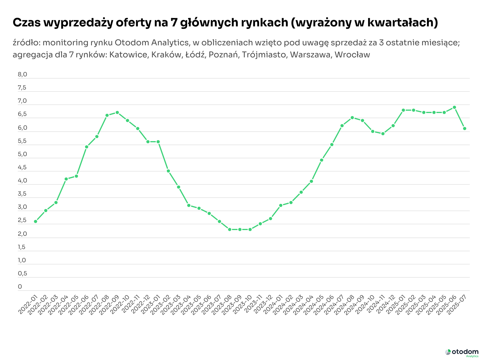 W Warszawie sprzedano w lipcu ponad 1,3 tysiąca mieszkań, co oznacza najlepszy miesięczny wynik w 2025 roku. To poziom zbliżony do okresu sprzed uruchomienia programu Bezpieczny Kredyt 2 proc. Jednocześnie warszawska oferta jest obecnie o 33 proc. większa niż dwa lata temu. Skala rynku sprawia, że każda zmiana wyraźnie wpływa na wskaźnik wyprzedaży, który przekroczył poziom sześciu kwartałów.